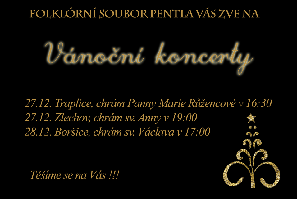 Jako každý rok i letos pořádáme s FS Pentla několik Vánočních koncertů. Uskuteční se ve dnech 27. a 28. prosince v obcích Traplice, Zlechov a Boršice.